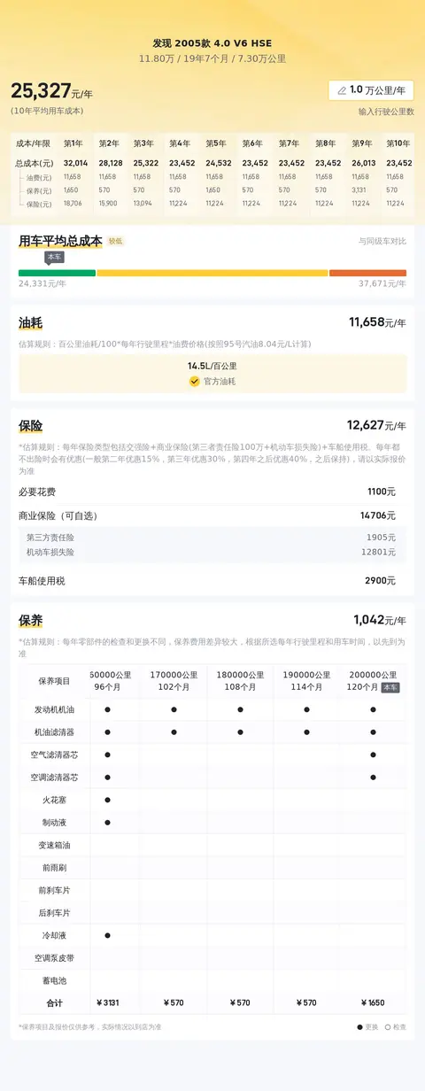 据估算,同级车的最低用车成本是17788元/年,最高是37721元/年,发现 2005款 4.0 V6 HSE是25188元/年,用车成本适中。