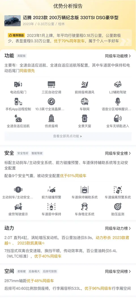 综上所述的新车含税价、用车成本、市场行情、优势分析、同款比价等数据仅供参考。在配置部分,因为二手车非标品,车辆可能会存在配置改装的情况,具体车况信息需要线下结合车辆实际情况进行综合参考。