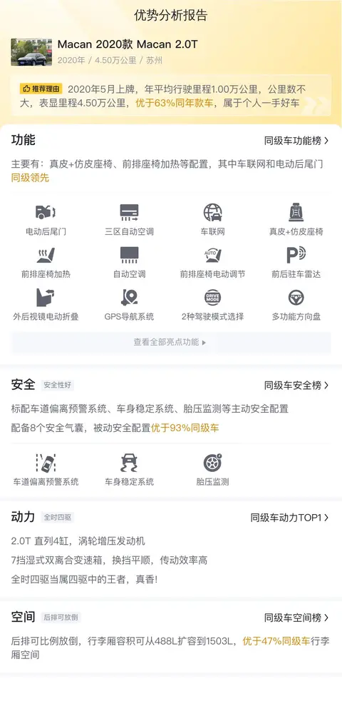 我们先简单了解这辆Macan的基础信息,该车具体版本为Macan 2020款 Macan 2.0T,定位是中型SUV,外观颜色为蓝色,内饰是深色配色。累计行驶里程是4.50万公里,该车符合国VI排放标准。车源地和上牌地都在苏州。2020年05月首次上牌,在此期间过户0次。新车含税价为59.46万,现在的二手车报价是30.50万,相当于开4年多便宜了28.96万。