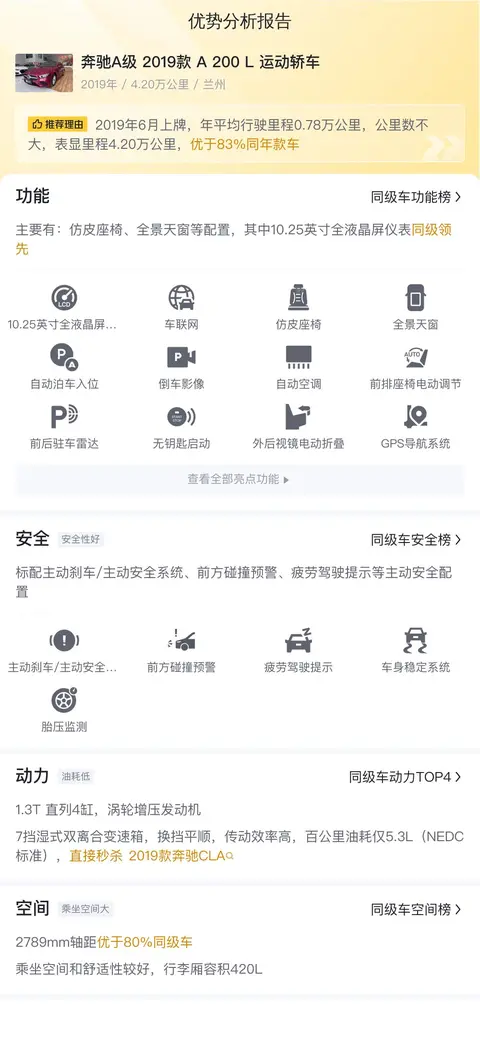 奔驰A级(图片|配置|询价)作为德国豪华汽车制造商奔驰旗下的一款紧凑型轿车,自1997年首次亮相以来,经历了多次迭代,每代车型都在保留原有优势的基础上,融入了更多创新科技和设计元素,以满足不断变化的市场需求和消费者偏好。今天要说这款奔驰A级 2019款 A 200 L 运动轿车,车源地是兰州,上牌时间是2019年6月,过户1次,跑了4.2万公里,新车含税价28.95万,现在二手卖价11.58万。