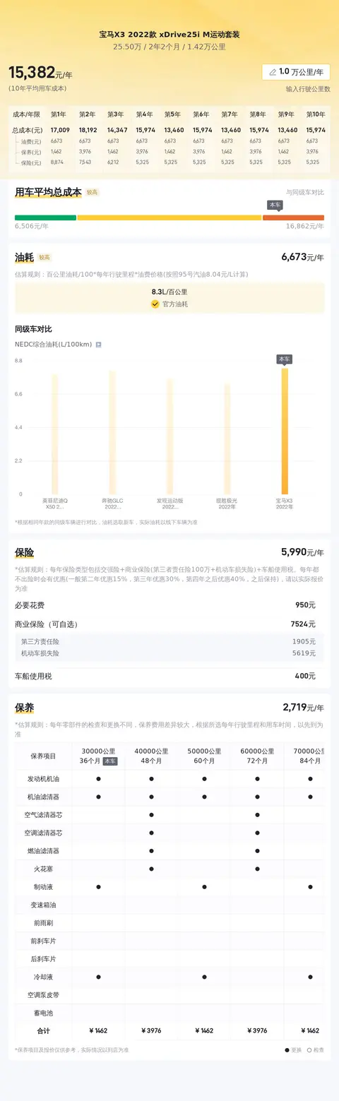 当前这款宝马X3的二手车市场行情在23万至29万左右,该车售价25.5万,处于正常范围内。根据估算,这辆车的10年平均用车成本约为15180元/年。