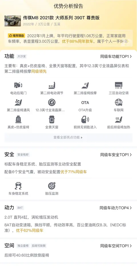优势:这款传祺M8 2021款 大师系列 390T 尊贵版的配置较丰富,而且座椅舒适度高,坐起来也更舒服。市场行情价是14.45万-17.04万,它的报价是16.60万,价格虽然合理,但还是有点高。好在保值率高,也缓和了一下价格高的局面。同时这款车是实车实拍,原汁原味的展示,没有经过第三方调表之类的操作。