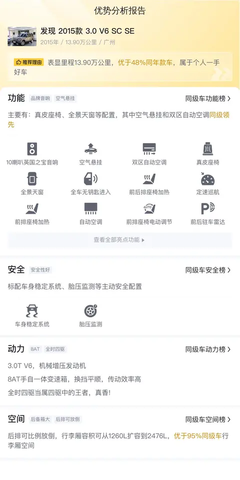 针对发现 2015款 3.0 V6 SC SE,懂车帝进行了深入分析,并与相似级别的车辆进行了对比,从而总结出了该车型所具有的核心优势及待改进之处。