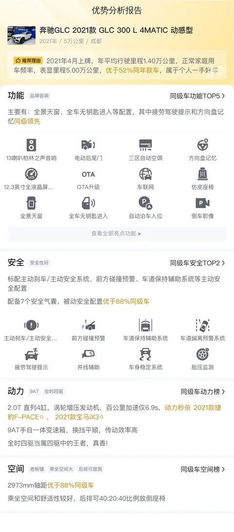 咱们今天聊的这款奔驰GLC 2021款 GLC 300 L 4MATIC 动感型,是2021年4月上牌,5年车龄,跑了5万公里,家用车,年平均行驶里程0.9万公里,小于家庭常规用车频率,此车未来再转让还可再开5年。这辆车车源地跟上牌地都是成都,过户次数0次,新车含税价49.64万,目前二手报价28.8万,白车深色内饰,可提供看车视频。