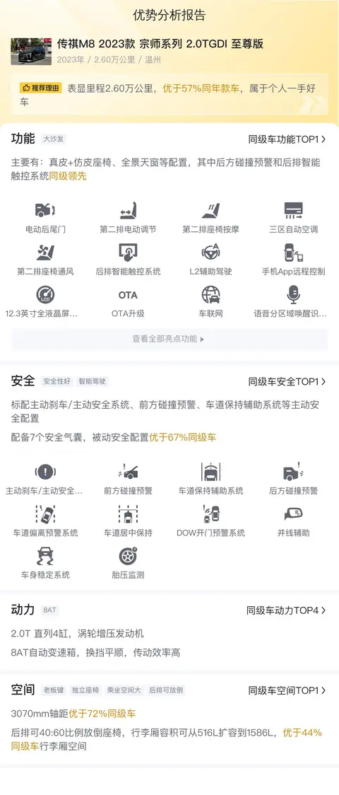 优势:配置高,动力强,空间大,这款传祺M8 2023款 宗师系列 2.0TGDI 至尊版的配置放眼整个同级别车型中都是数一数二的,尤其是舒适性配置,妥妥的商务标杆。空间大,适合全家出行。动力强悍,无论是家用还是商用都能轻松应对。