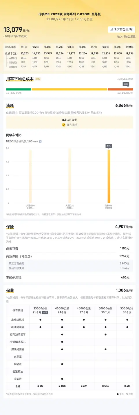 据估算,同级车的最低用车成本是13188元/年,最高是18798元/年,传祺M8 2023款 宗师系列 2.0TGDI 至尊版是13333元/年,所以比较低。