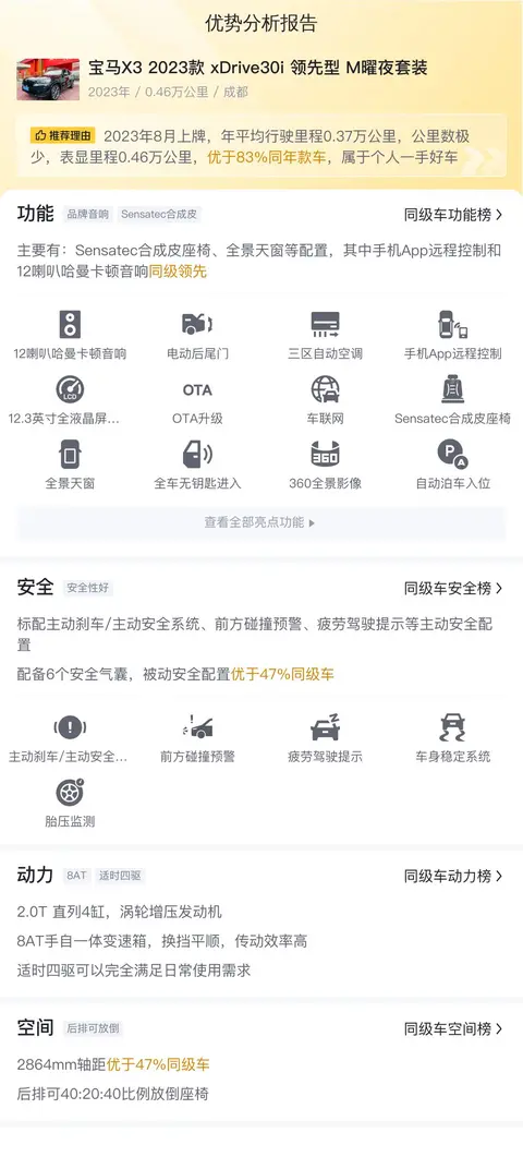 今天介绍的这款二手宝马X3具体版本是——2023款 xDrive30i 领先型 M曜夜套装,它的上牌地为成都,上牌日期2023年8月,表显里程4600公里,车身颜色为黑色,0过户。新车指导价44.39万,而现在的二手车报价31.2万。
