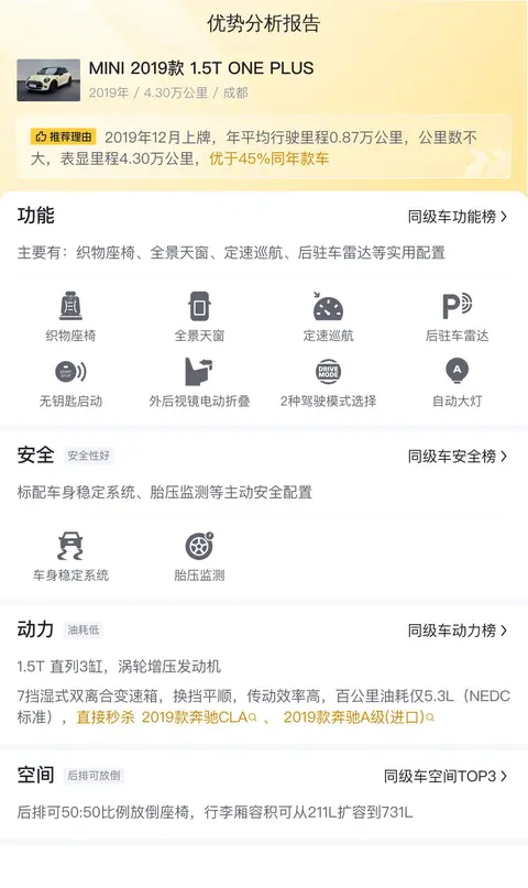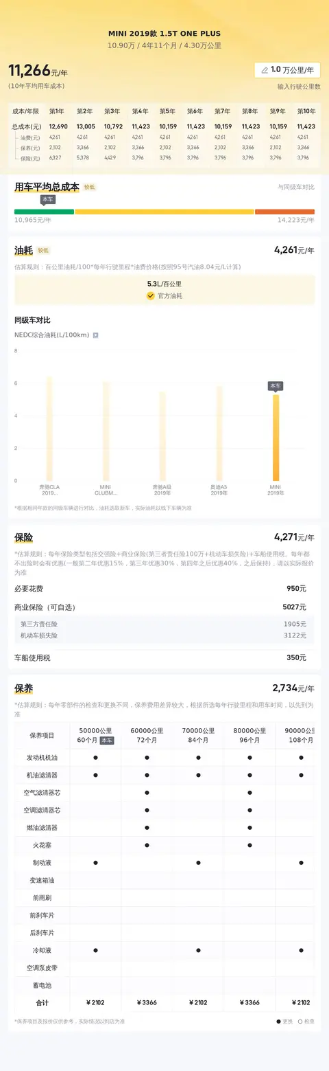 另外,同级车的最低10年平均用车成本是5533元/年,最高是13773元/年,而MINI 2019款 1.5T ONE PLUS是10680元/年,用车成本适中,同时和新车相比,平均用车成本节省2307元/年。