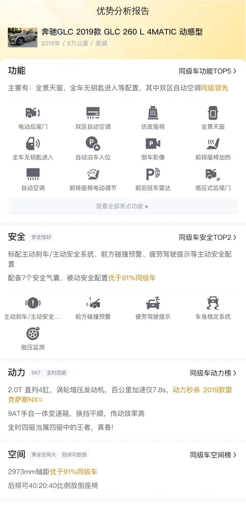优势:奔驰GLC 2019款 GLC 260 L 4MATIC 动感型的市场行情价是19.01万-25.93万,它的报价则是16.88万,这个价格也太香了吧!加上本身又是热门车型,所以性价比很高。配置上,标配主动刹车/主动安全系统、前方碰撞预警、车道保持辅助系统等主动安全配置,配备7个安全气囊,配置丰富。动力也强,空间宽敞,表现都还不错。