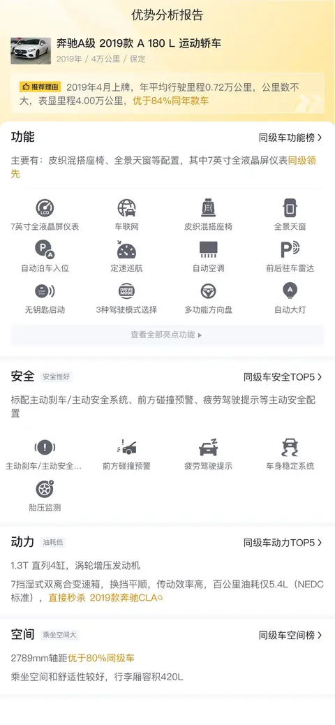 买二手车,配置要实用。这辆奔驰A级 2019款 A 180 L 运动轿车配备了皮织混搭座椅、分段式可开启全景天窗等,其中7英寸全液晶屏仪表同级领先。在安全配置上,标配主动刹车/主动安全系统、前方碰撞预警、疲劳驾驶提示等主动安全配置,配备7个安全气囊,被动安全配置优于96%同级车。
