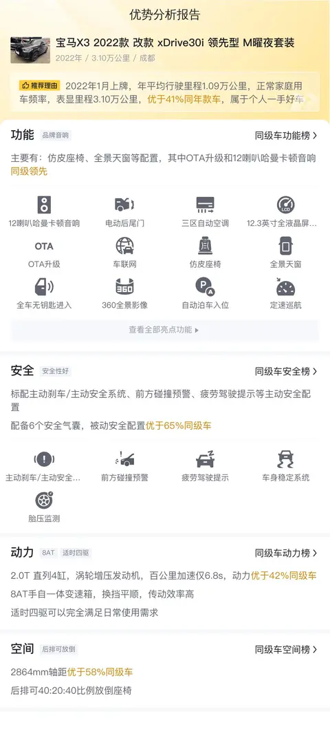 今天给大家带来的这款宝马X3 2022款 改款 xDrive30i 领先型 M曜夜套装,上牌地、车源地均在四川成都,上牌时间为2022年1月,表显里程3.10万公里,新车指导价44.19万,该车报价28.78万,过户次数0次,可做2-5成首付,分期最长5年。