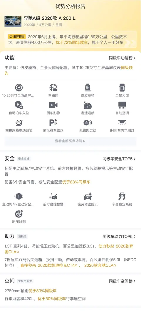 综上所述,购买二手车的决策过程中,理解并评估所有相关的成本、好处和潜在挑战至关重要。每辆车都有其独特的使用历史和当前状况,而这些因素显著影响着车辆的价值和维护需求。在做出购买决定之前,建议潜在买家不仅要考虑初始购买价格,还要考虑车辆的运行成本、保养记录、公里数以及预期的使用寿命。通过细致比较不同车辆的这些方面,买家可以做出更加知情和经济实惠的选择。当然,如果您对这辆奔驰A级2020款 A 200 L运动轿车很感兴趣,也可以线下看实车感受下。毕竟百闻不如一见,百看不如一试。