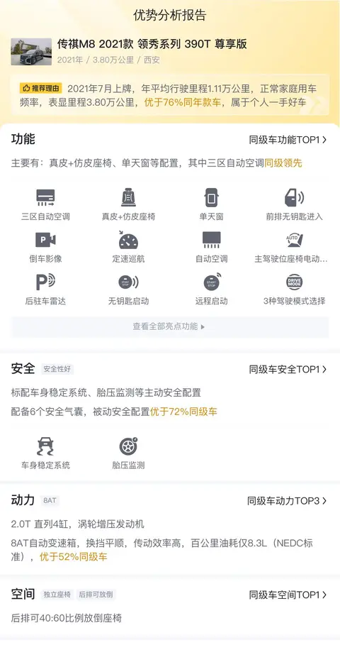 综上所述,这辆二手传祺M8 2021款 领秀系列 390T 尊享版在动力性能、舒适性和空间方面表现出色,适合那些注重性价比和实用性的消费者。然而,它在科技配置和保值率方面的不足也需要消费者在购买时加以考虑。建议你在做出购买决定之前,对这款车进行充分的了解和试驾,以确保它符合你的需求和期望。