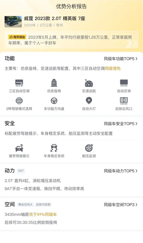 综上所述的新车含税价、用车成本、市场行情、优势分析、同款比价等数据仅供参考。在配置部分,因为二手车非标品,车辆可能会存在配置改装的情况,具体车况信息需要线下结合车辆实际情况进行综合参考。
