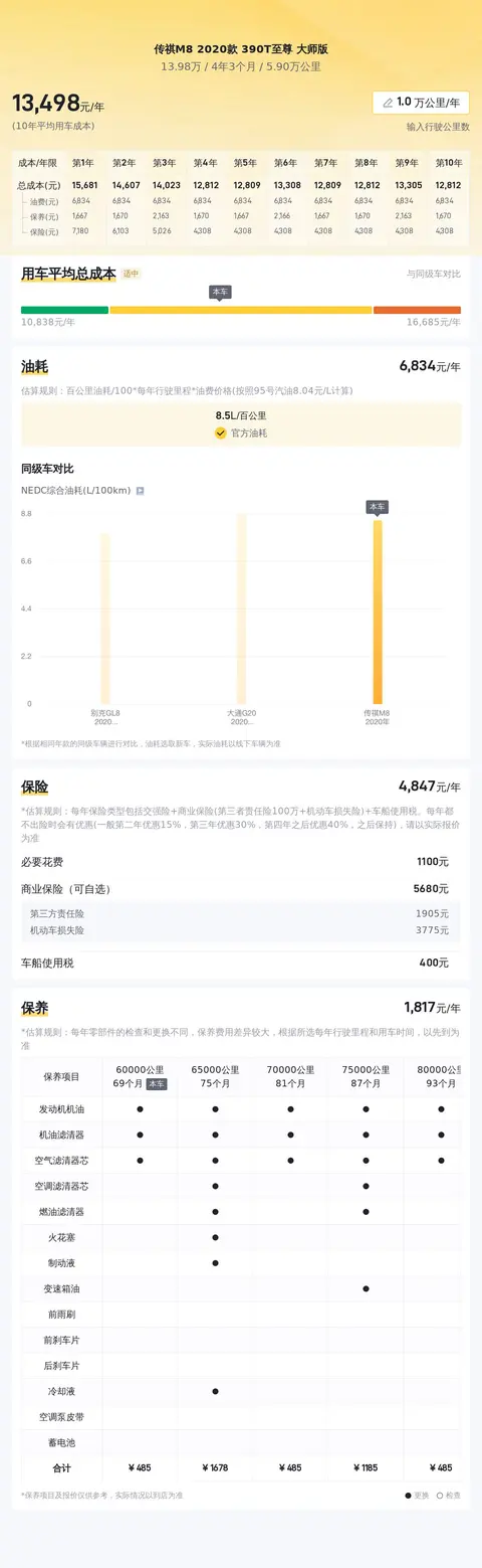 经过懂车帝综合分析,这辆车的10年平均用车成本大概是13443元/年,与同级别车相比,用车成本适中。具体的费用是每年燃油费约7115元/年,保险费用大概5154元/年,保养费用每年176元,不过这些费用跟车主的用车场景和用车强度有直接关系,所以会有波动。