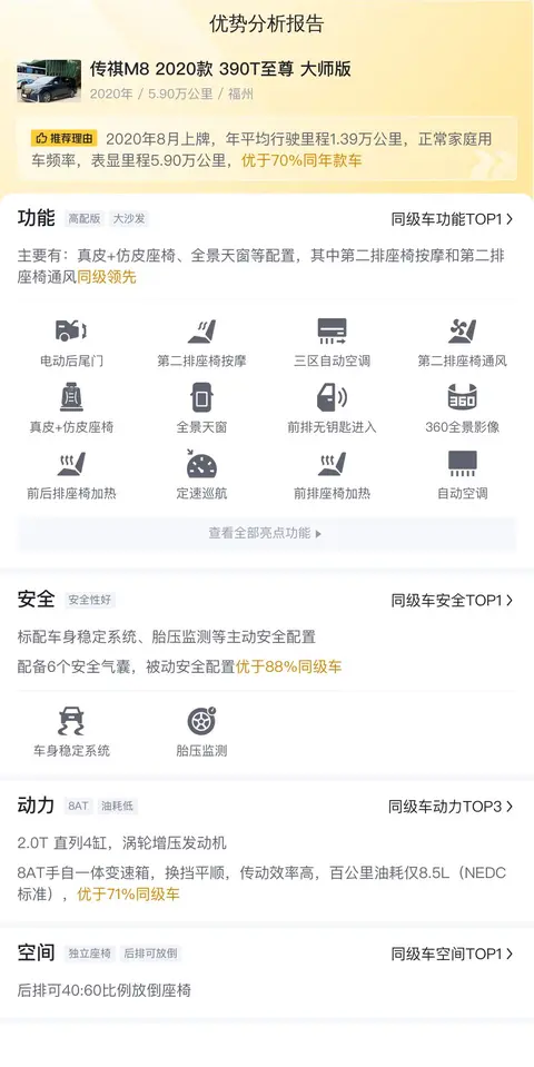 这辆传祺M8 2020款 390T至尊 大师版定位是中大型MPV,车身外观颜色是白色,内饰是深色配色。车源地和上牌地都在福州。2020年8月首次上牌,在此期间过户1次。同时累计行驶里程是5.9万公里,该车符合国VI排放标准。新车含税价是27.67万,现在的二手车报价是13.98万,相当于开4年多便宜了11.3万。