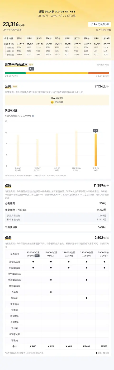 在用车成本方面,根据懂车帝的大数据分析,这辆发现的10年平均用车成本约为2.3万元/年。这一成本在同级别车型中处于适中的水平,对于追求性价比的消费者来说,这是一个可以接受的成本范围。在保险费用方面,预估每年约1.1万元,这一费用涵盖了基本的车险和必要的商业险种,为车主提供了全面的保障。而在保养费用方面,预估每年约4336元,这一费用包含了常规保养和必要的零部件更换,确保了车辆的正常运行和延长使用寿命。此外,根据车主的反馈,这辆发现每百公里油耗约为11.6升。按照当前油价计算,每年的油费支出大约在1万元左右(假设每年行驶2万公里)。尽管这一油耗水平相对较高,但考虑到发现的强大动力和越野性能,这一油耗表现仍在可接受范围内。