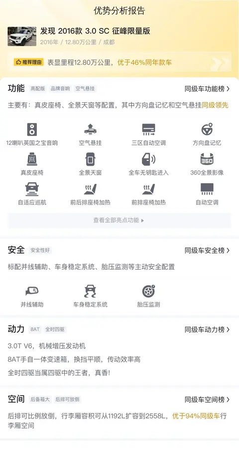这辆2016款路虎发现3.0 SC 征峰限量版首次上牌时间为2016年9月,截至目前,该车行驶里程为12.8万公里,该车车源所在地和上牌地均为成都,有过3次过户记录。该车新车指导价为104.8万,目前二手车市场报价29.8万。