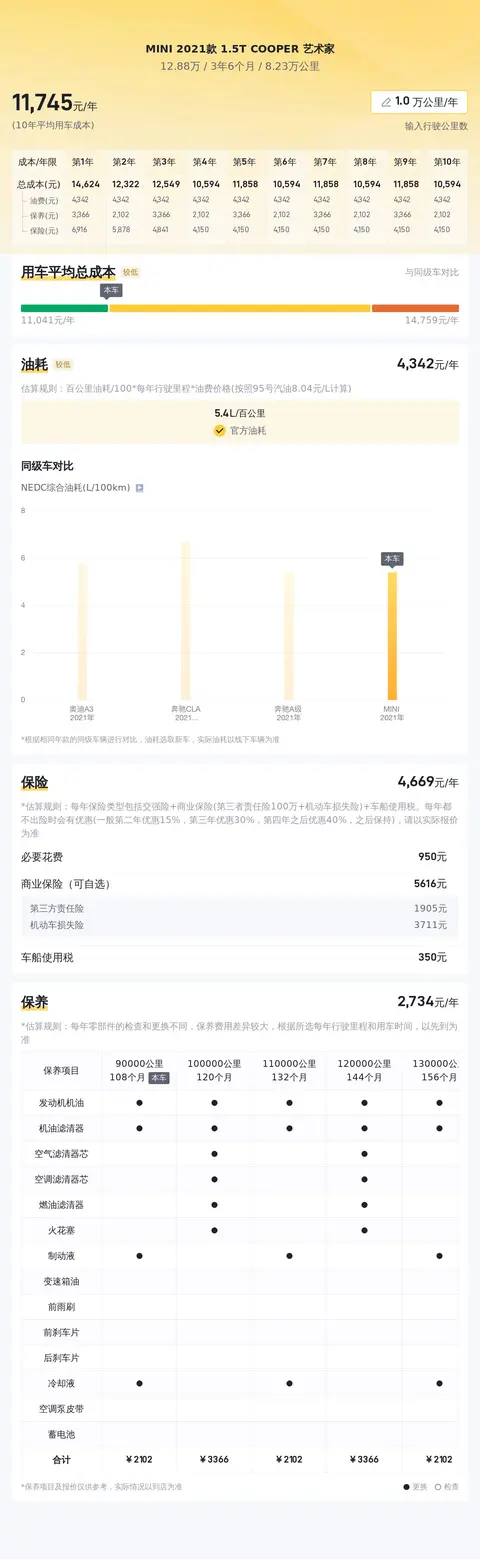 拥有一辆MINI,可不是烧钱的代名词。这位小宝贝的胃口可不大,油耗仅为5.4L/百公里,算是勤俭持家的小能手了。保险费用一年约4578元,保养费用一年约3240元,这都是小数目,重要的是她能给你带来的快乐,那是无价的。