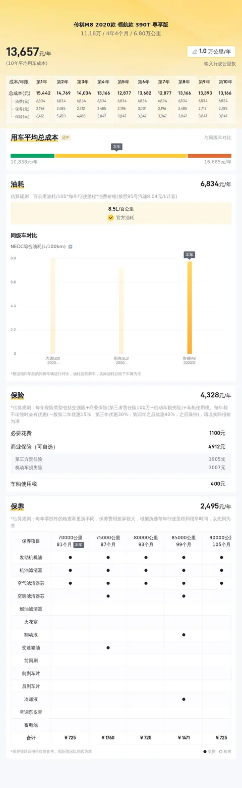 根据懂车帝的大数据分析,这辆车的10年平均用车成本大约是13677元/年,其中油费约7160元/年,保险费用约4478元/年,保养费约39元/年。