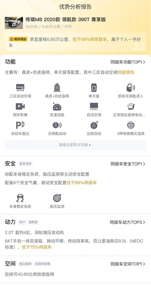 这辆传祺M8 2020款 领航款 390T 尊享版配备了真皮+仿皮座椅、单天窗等配置,其中三区自动空调同级领先。在安全配置上,标配车身稳定系统、胎压监测等主动安全配置,配备6个安全气囊,被动安全配置优于56%同级车。在空间上,后排可40:60比例放倒座椅,行李厢容积590L,优于56%同级车行李厢空间。在动力上,搭载的是2.0T 直列4缸,涡轮增压发动机,8AT手自一体变速箱,换挡平顺,传动效率高,百公里油耗仅8.5L(NEDC标准),优于75%同级车。