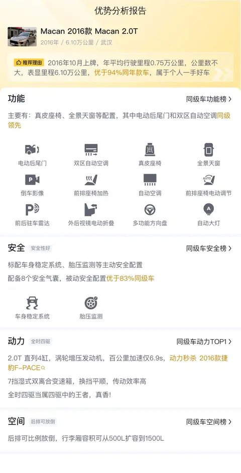 今天我们要看的这台Macan正是当年入门款的2016款 Macan 2.0T,该车目前位于武汉,上牌时间2016年10月,表显里程6.1万公里,香槟色车身深色内饰,新车指导价55.8万,二手车报价14.2万,过户次数0次。