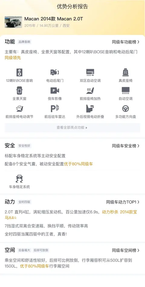 市场行情也是决定这款车价值的重要因素。目前,这款Macan的二手车行情大致在17.86万至21.5万之间。值得注意的是,具体的售价会受到车辆状况等因素的影响,而本车14.88万的报价相较于市场行情来说属于较低的水平,这也体现了本车较高的性价比。