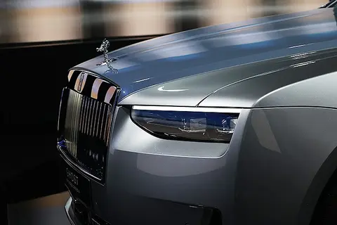 看到了吗,古思特系列 II 把劳斯莱斯最标致性的方灯造型改了,可以说是以最小的改动换来了最大的变化,车灯上部的轮廓线条自帕德嫩神庙进气格栅的「门楣」下部起笔,横向延伸至两侧前叶子钣边缘,包含进气格栅的切角也跟 Spectre 有点像,切角更为圆润,夜里也可以透出光线,而这项功能也与库里南系列 II 一样成为标配。