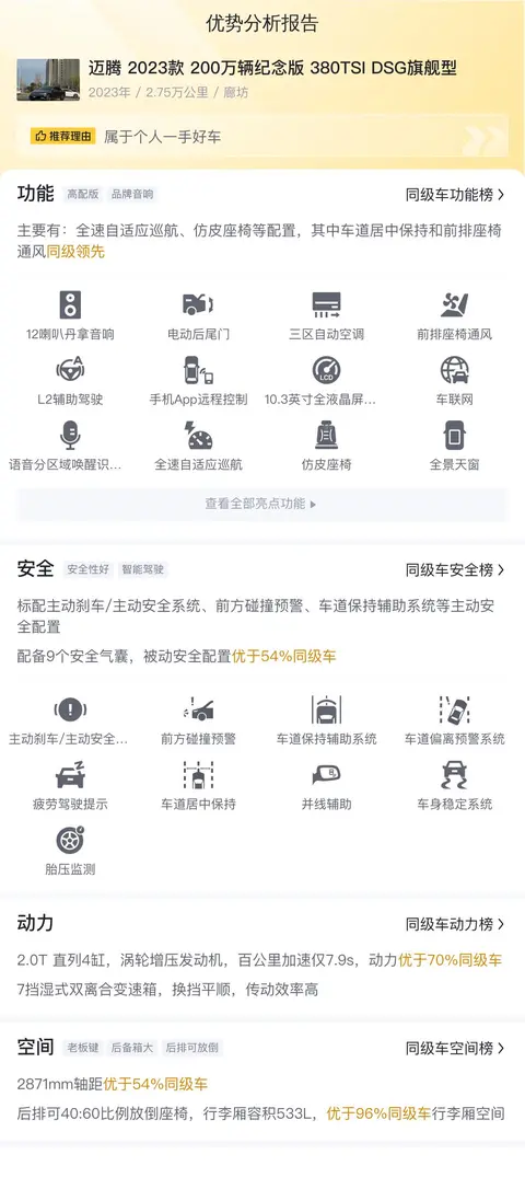 车况说完了,咱们聊聊这辆车的配置,迈腾 2023款 200万辆纪念版 380TSI DSG旗舰型配备了全速自适应巡航、3种驾驶模式可选、三区自动空调等配置,其中L2辅助驾驶和手机无线充电同级领先。在安全配置上,标配主动刹车/主动安全系统、前方碰撞预警、并线辅助等主动安全配置,配备6个安全气囊,被动安全配置优于61%同级车。这些配置不仅提升了驾驶的便利性和舒适性,还增强了行车的安全性。
