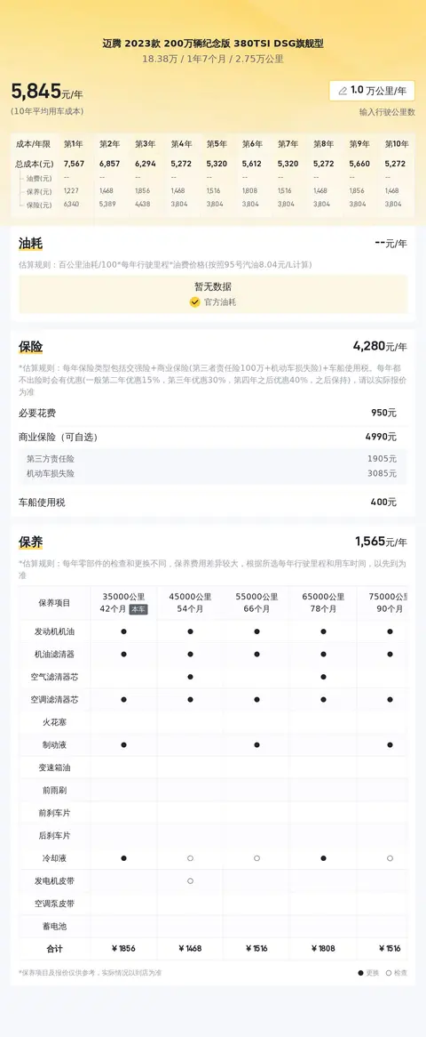 这辆车的用车成本包括燃油费、保养费、保险费,根据估算,这辆车的用车成本一年约12602元,实际用车成本要看车主的用车情况而定。