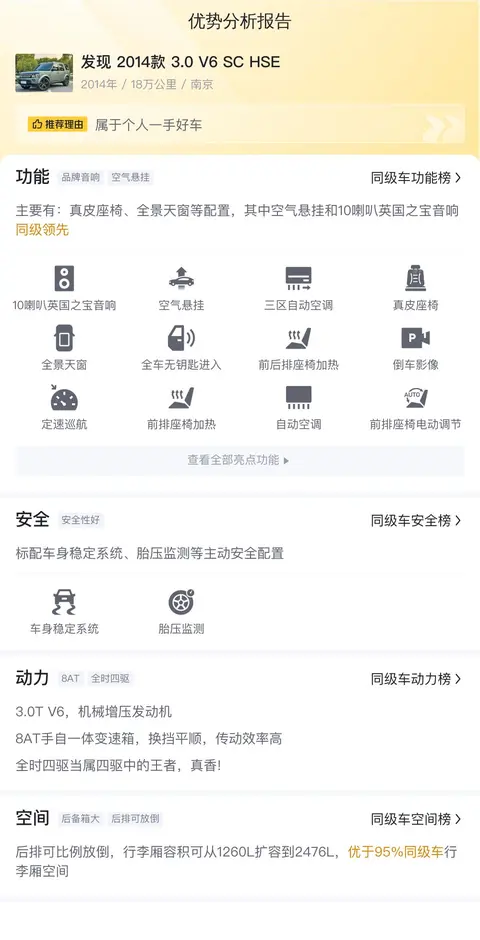 接下来,咱们聊聊大家喜闻乐见的价格部分。影响二手车价格的核心因素主要包括车辆的使用年限、行驶里程数以及车辆保养状态等。当然,具体的车况才是决定成交价格的决定性要素。根据目前的市场行情,这款发现 2014款 3.0 V6 SC HSE的二手市场价格区间大约在21万至31万左右。需要注意的是,市场行情价与最终成交价存在差异,车辆的最终售价会根据具体的车况和卖家设定的价格来决定。