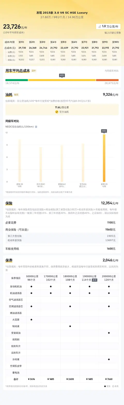 官方数据显示,发现 2015款 3.0 V6 SC HSE Luxury WLTC综合油耗为11.6L/百公里,百公里加速时间为8.1秒,纯市区开必然会超过11.6L的,这个大家要有心理准备,毕竟排量和动力摆在那,不是说咱有多爱听发动机咆哮,只是有的时候,不得不稍微牺牲点油耗,去体验一把速度激情,谁买谁明白!