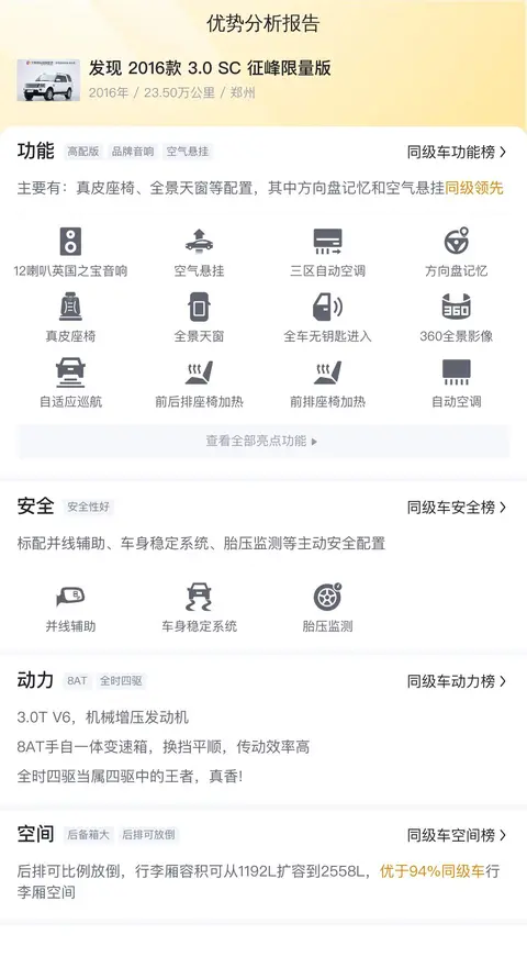 这辆发现 2016款 3.0 SC 征峰限量版的优势是动力强劲,空间大,毕竟是中大型SUV,同时舒适性配置也比较全,配备了真皮座椅、全景天窗、空气悬挂等。