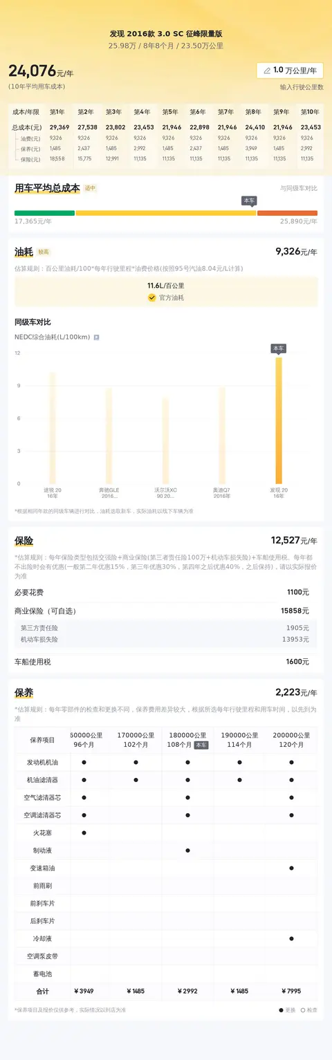 据估算,同级车的最低用车成本是19783元/年,最高是27728元/年,发现 2016款 3.0 SC 征峰限量版是23638元/年,所以不算低。