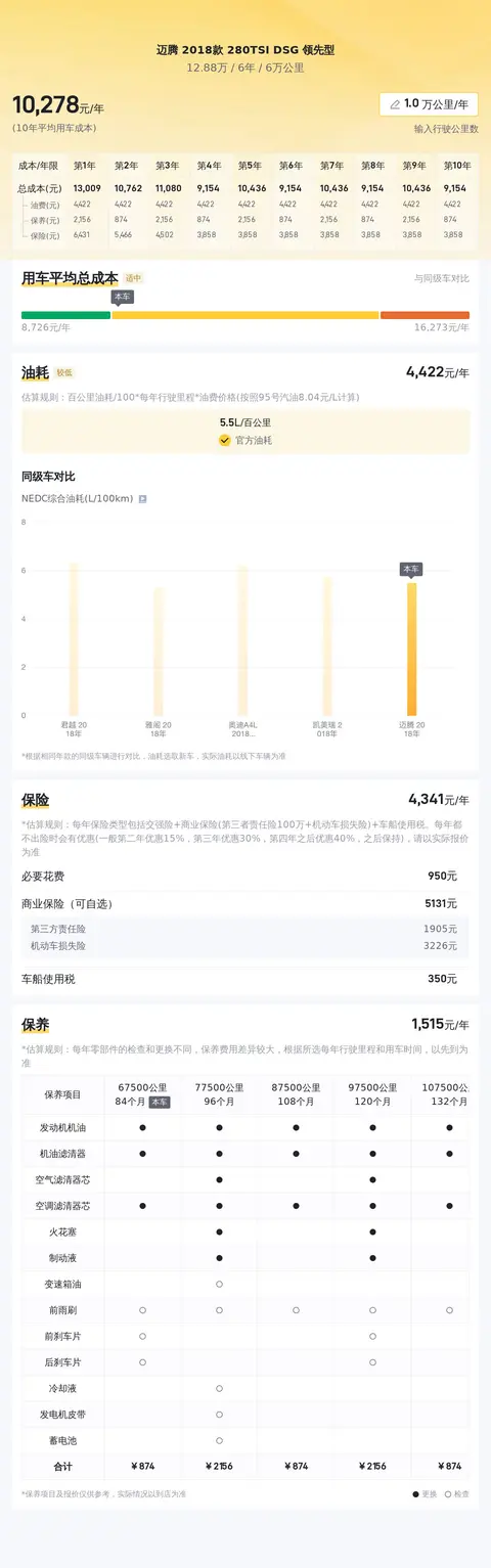 买二手车,不仅要考虑买车成本,还要把用车成本纳入整体购车预算之中。接下来,我们就来看看这辆车的用车成本表现如何?