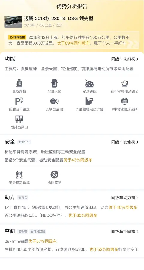 这辆车的款型是——迈腾 2018款 280TSI DSG 领先型,表显里程6万公里,2018年12月上牌,没有过户记录,车源地跟上牌地均为长沙,黑色车身。该车新车指导价20.99万,今天要说的这辆二手车报价12.88万。