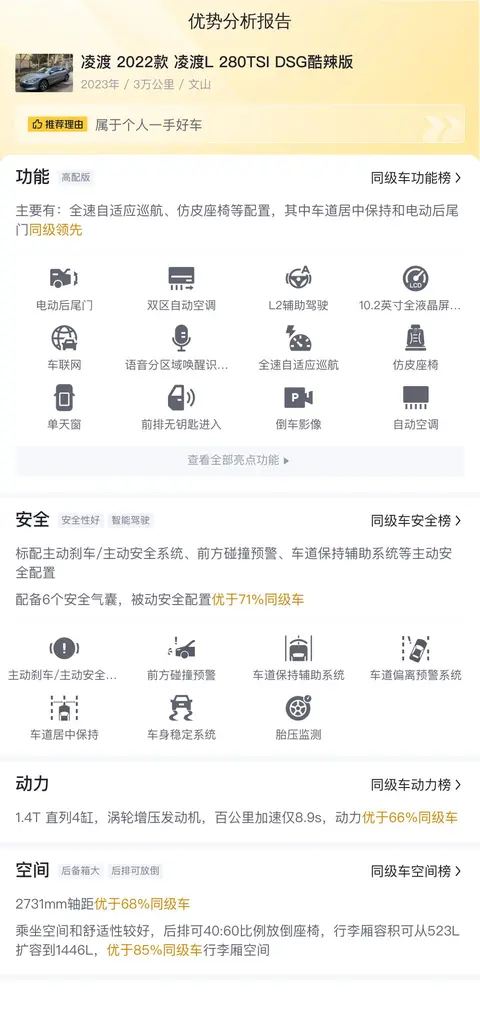 在配置方面,这款凌渡 2022款 凌渡L 280TSI DSG酷辣版配备有全速自适应巡航、仿皮座椅等配置,其中车道居中保持和电动后尾门更是同级领先。在动力方面,它搭载了1.4T 直列4缸,涡轮增压发动机,百公里加速仅8.9s,动力优于66%同级车。同时,2731mm轴距优于68%同级车,乘坐空间和舒适性较好。后排可40:60比例放倒座椅,行李厢容积可从523L扩容到1446L,优于85%同级车行李厢空间。