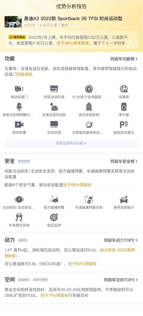 据估算,同级车的最低用车成本是5398元/年,最高是14738元/年,奥迪A3 2022款 Sportback 35 TFSI 时尚运动型是12183元/年,所以用车成本比较高。