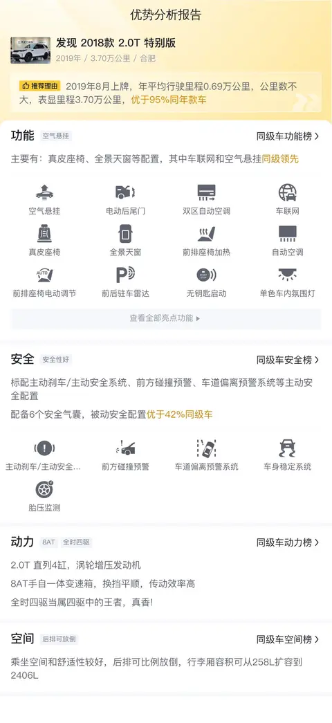 本次我们要介绍的是一款发现 2018款 2.0T 特别版,首次上牌时间为2019年8月,车源地及车牌地均为合肥,过户次数为1次,车身颜色为白色,该车的表显里程为3.7万公里,该车符合国V排放标准。在价格方面,新车指导价为72.77万,而现在的二手车报价为29.88万。