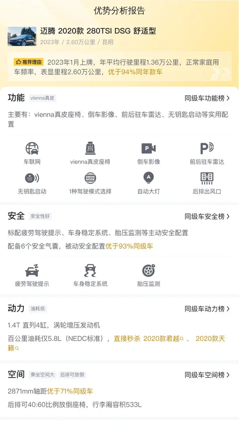 迈腾 2020款 280TSI DSG 舒适型主要配有vienna真皮座椅、倒车影像等配置,其中车联网同级领先。动力方面,搭载1.4T 直列4缸,涡轮增压发动机,百公里油耗仅5.8L(NEDC标准),动力与能耗表现均优于2020款君越、2020款天籁。空间方面,2871mm轴距优于71%同级车,后排可40:60比例放倒座椅,行李厢容积533L,优于52%同级车行李厢空间。
