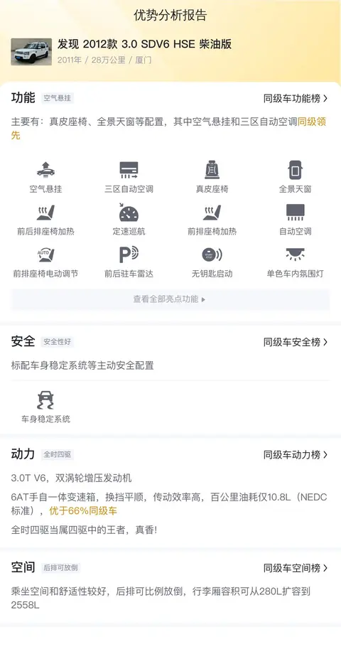 这辆发现 2012款 3.0 SDV6 HSE 柴油版是一辆白色外观的二手车,于2011年12月在厦门上牌,至今已行驶28万公里,有过5次过户记录。按照每年行驶2万公里计算,该车已经跑了14年的里程。由于该车没有检测报告,所以不能为您详细的解读车辆的具体车况,不过我们今天先不关注车况,先来看看这辆车其它方面的表现是否能够让您满意。