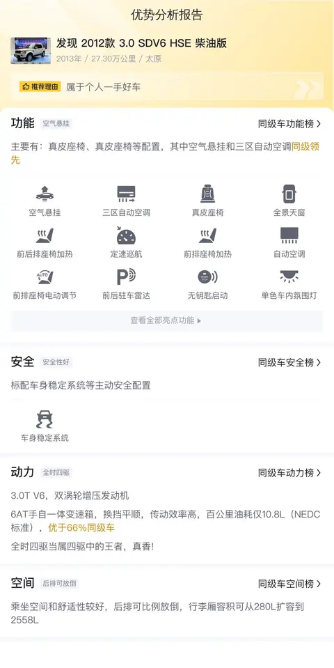 发现(图片|配置|询价),是英国高端汽车品牌路虎(Land Rover)旗下的一款豪华SUV车系。诞生于1989年的路虎发现系列,历经五代车型的演进,持续引领着豪华越野车领域的创新与风尚。今天我们就为您带来一辆二手路虎发现,带您领略其独特的魅力。先说一下车辆的基本信息,该车的具体版本是——发现 2012款 3.0 SDV6 HSE 柴油版,车身颜色为白色,上牌日期为2013年2月,表显里程为27.30万公里,此车未过户。车源所在地和上牌地都在太原,新车指导价84.80万,目前二手车报价20.88万。