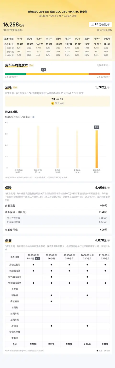 在用车成本方面,根据估算,这辆车的年均综合用车成本约为1.6万元左右。百公里油耗为7.3升,按一年行驶2万公里计算,燃油费用约为1.2万元/年,保养费用约为3118元/年,保险费用约为6464元/年。实际费用根据车主的使用情况可能会有所不同。