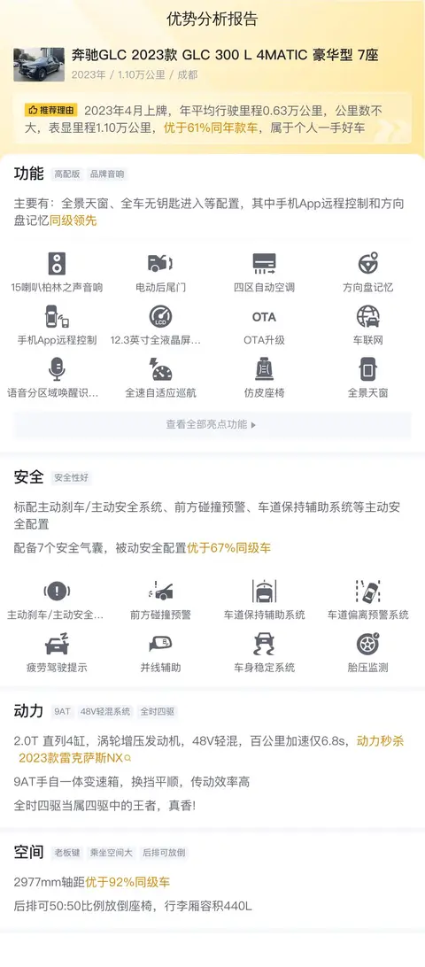 这辆二手奔驰GLC 2023款 GLC 300 L 4MATIC 豪华型 7座来自成都,车牌所在地也是成都,首次上牌时间为2023年4月,表显里程为1.1万公里,未进行过过户,是一辆5门7座的SUV。这辆车的新车指导价为53.13万元,目前二手车报价为38.5万元,相较于新车价格便宜了14.63万元。