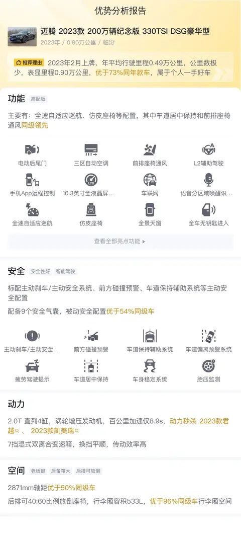 综上所述的新车含税价、用车成本、市场行情、优势分析、同款比价等数据仅供参考。在配置部分,因为二手车非标品,车辆可能会存在配置改装的情况,具体车况信息需要线下结合车辆实际情况进行综合参考。