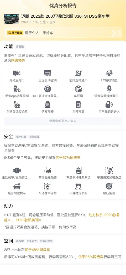 综上所述的新车含税价、用车成本、市场行情、优势分析、同款比价等数据仅供参考。在配置部分,因为二手车非标品,车辆可能会存在配置改装的情况,具体车况信息需要线下结合车辆实际情况进行综合参考。
