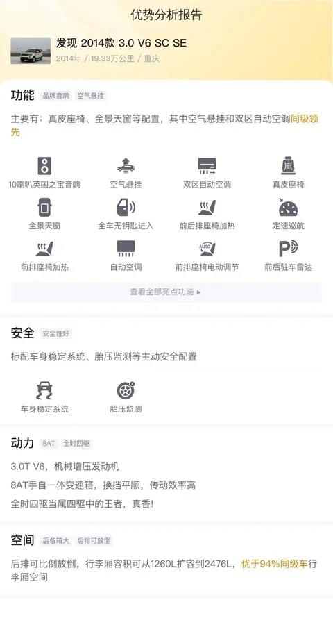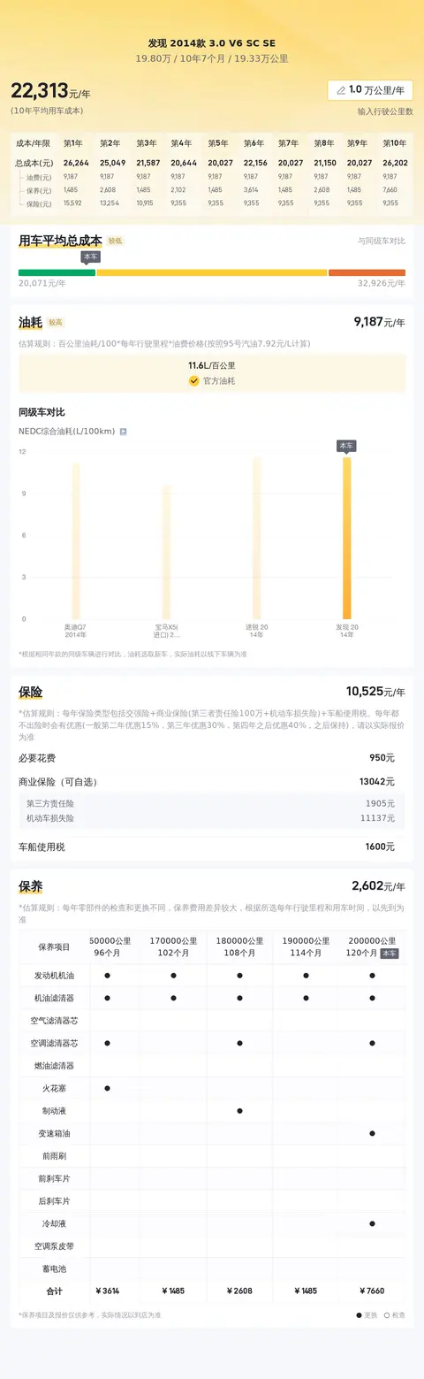 除了同款比价,我们更应该关注这辆车的用车成本。根据估算,这辆发现 2014款 3.0 V6 SC SE的年均综合用车成本约为2.2万元左右。当然,这个跟车主的用车方式和场景也有直接关系。