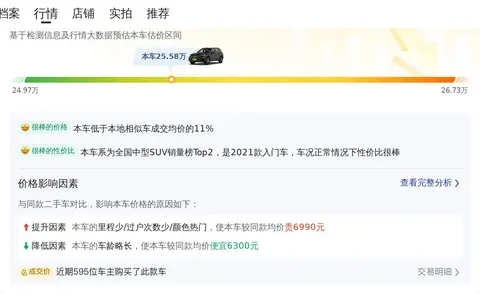自2021年1月上牌以来,该车价格变化为:2021年1月价格32.98万元,2022年1月价格29.60万元,2023年1月价格26.75万元,当前价格25.58万元。价格逐年下降,且当前价格低于全国相似车成交均价(28.15万),说明这辆车比较受欢迎,是一个不错的选择。