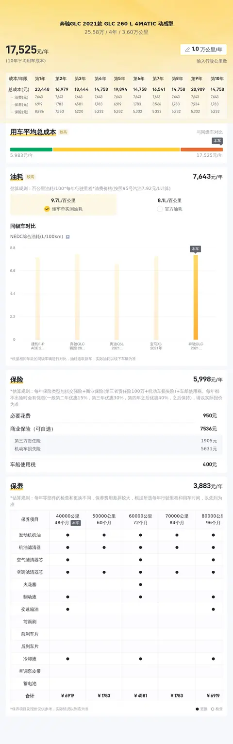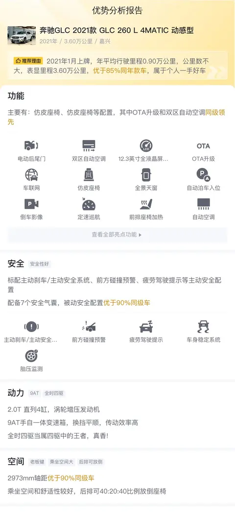 综上所述,这辆二手奔驰GLC在车况、市场行情、用车成本、优势分析、同款比价等方面都表现出色,非常值得消费者考虑。同时,文中提到的用车成本、市场行情、优势分析、同款比价等数据仅供参考,具体的车况信息还需要结合车辆实际情况进行综合参考。