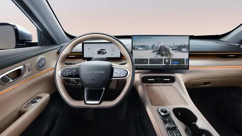 车内采用了双色内饰材质搭配木纹饰板及256色无级炫彩氛围灯,中控台配备了全液晶仪表以及15.6吋超大2.5K高清屏,内置高通骁龙8155芯片和Lion5.0 AI智慧座舱系统。